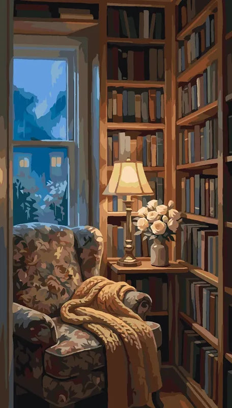 Tässä numeromaalauksessa kukkakuvioinen nojatuoli on sijoitettu kirjahyllyjen väliin. Pöydällä on pöytälamppu ja maljakollinen vaaleita kukkia. Ikkunasta näkyy sinertävä iltataivas ja vastapäisen talon valot. Maalattavana on paljon kirjoja, varjoja ja pehmeitä kankaita, jotka tuovat vaihtelua. Sopii yksityiskohtien ystäville ja sisustusaiheista pitäville.