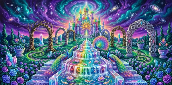 Tässä timanttimaalauksessa astut satumaiseen maailmaan, jossa kirkaslinjainen linna kohoaa keskellä värikästä puutarhaa. Sateenkaaren sävyinen suihkulähde, loistavat kristallit ja ylväät riikinkukot tuovat kuvaan mystiikkaa ja loistoa. Violetti, sininen ja vihreä yhdistyvät upeasti tähtitaivaan ja maagisten kasvien kanssa.