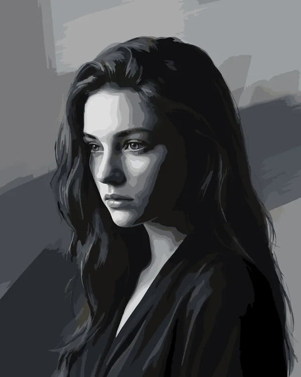 Tässä numeromaalauksessa on nuori nainen, joka katsoo sivulle varjoisassa valaistuksessa. Kuvassa korostuvat tummat hiukset, kasvonpiirteet ja valon sekä varjon kontrastit. Harmaan, mustan ja valkoisen sävyt tuovat esiin syvyyttä ja ilmeikkyyttä. Kasvojen yksityiskohtia ja hiusten muotoja on miellyttävä maalata. Sopii erityisesti niille, jotka haluavat kokeilla muotokuvien maalaamista ja arvostavat selkeitä kontrasteja.